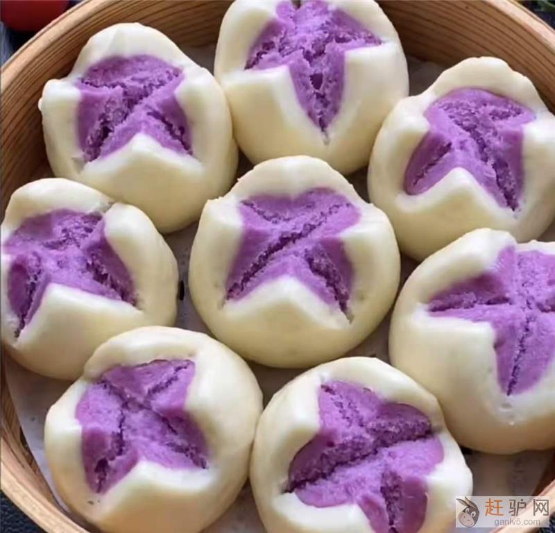 紫薯开花馒头,都不需要放糖,却也是香甜松软还有营养,好吃又易做,三不五时吃点紫薯,对身体健康也好。把紫薯去皮洗净切厚片入蒸锅,蒸至用筷子一戳即透的程度g.a.n.l.v.5.c.o.m,紫色面团也揉好后,就开始操作,图中从上到下的顺序:紫色面团也揉好后,就开始操作,图中从上到下的顺序:g_a_n_l_v_5_c_o_m①将白色面团和紫色面团(分别搓成长条后)分成大小相近的等份;②用擀面杖将白色小面团擀开擀圆(注意还是要留有一定的厚度,大概0.3-0.4厘米厚吧),并放入一小团紫色面团;③像包汤圆或包包子一样包起来,收口朝下,顶部用刀或厨房剪刀划十字,深度能看到紫色面团即可;口子不需要开得太长①将白色面团和紫色面团(分别搓成长条后)分成大小相近的等份;②用擀面杖将白色小面团擀开擀圆(注意还是要留有一定的厚度,大概0.3-0.4厘米厚吧),并放入一小团紫色面团;③像包汤圆或包包子一样包起来,收口朝下,顶部用刀或厨房剪刀划十字,深度能看到紫色面团即可;口子不需要开得太长g.a.n.l.v.5.c.o.m
